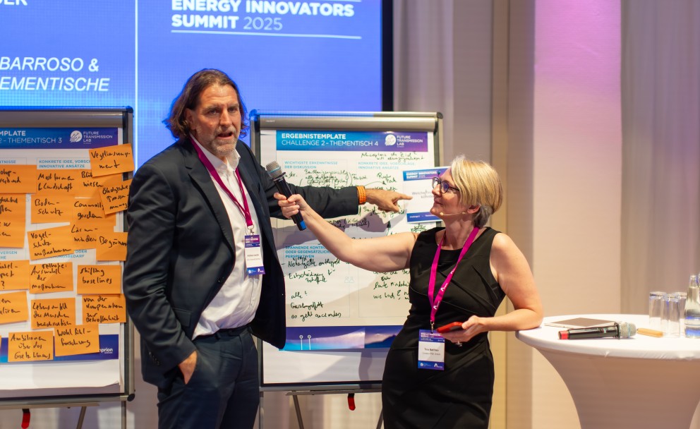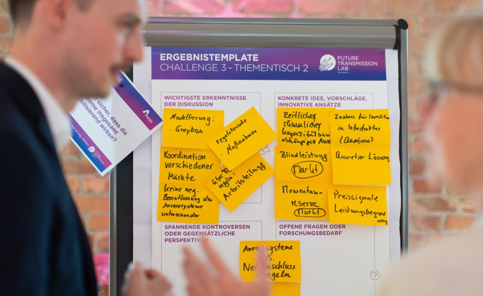 Dann ging es weiter in vier Energy Transition Challenges, bei denen Professor*innen und Doktorand*innen mit dem Publikum zu vier Kernthemen der Transformation debattierten. Zwei der Challenges fanden im Vortragsformat statt, zwei Challenges waren als interaktives Diskussionsformat ausgelegt. Dazu teilte sich das Publikum auf 8 verschiedene Thementische auf und diskutierte zu Fachfragen aus den Themenblöcken „Akzeptanz für den Netzausbau“ und „Anreizung von Flexibilitätseinsätzen“. Die Ergebnisse der Arbeitsgruppen zu präsentieren, war dann nochmal eine eigene Challenge: Zeitlimit 30 Sekunden!